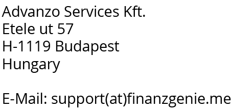 Wir weisen ausdrücklich darauf hin, dass die jeweils aktuelle Version der Allgemeinen Geschäftsbedingungen (nachfolgend „AGB“ genannt) dauerhaft im Internet unter finanzgenie.me/terms zur Verfügung steht. Es besteht außerdem jederzeit die Möglichkeit, die AGB mit Hilfe der allgemeinen Browser-Funktionen auszudrucken (Menü „Datei“ – Befehl „Drucken“) oder auf die eigene Festplatte oder ein anderes Speichermedium zu kopieren (Menü „Datei“ – Befehl „Speichern“). Der Nutzer wird hiermit ausdrücklich zur Einsichtnahme, zum Ausdruck und zum Kopieren dieser AGB aufgefordert. Es gelten diese AGB`S in der Ungarischen und Deutschen Fassung. Falls inhaltliche Diskrepanzen durch die Übersetzung auftreten, gelten die jeweils gültigen in der ungarischen Fassung.